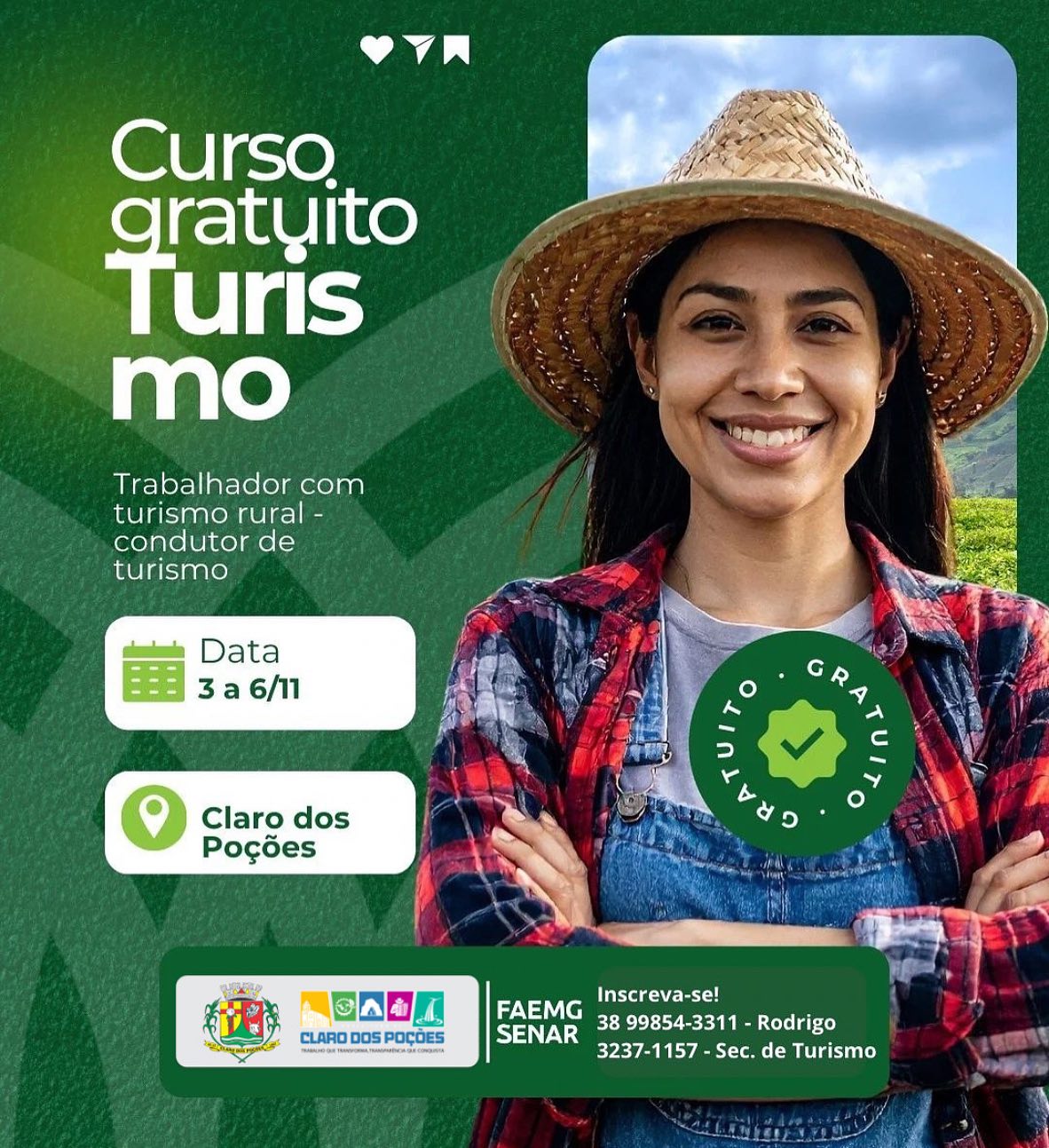 A Prefeitura Municipal de Claro dos Poções-MG, por meio da Secretaria de Cultura, Esporte, Lazer e Turismo, em parceria com o Sistema FAEMG/SENAR, anuncia uma excelente oportunidade de qualificação profissional: o Curso Gratuito de Trabalhador com Turismo Rural e Condutor de Turismo.