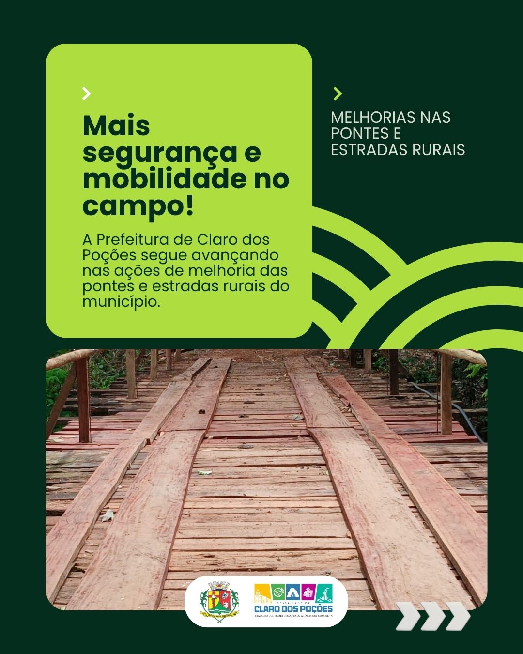 A Prefeitura de Claro dos Poções segue avançando nas ações de melhoria das estradas e pontes rurais, com o objetivo de garantir mais segurança e qualidade de vida para quem vive e produz no campo.