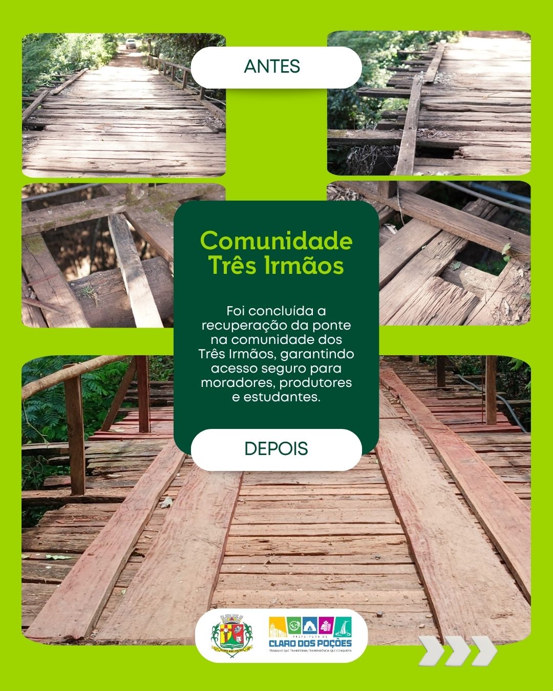Nos últimos dias, foram concluídas duas importantes obras de infraestrutura: a recuperação da ponte na comunidade dos Três Irmãos e a construção de uma nova ponte de cabo de aço na comunidade de João Sotero.